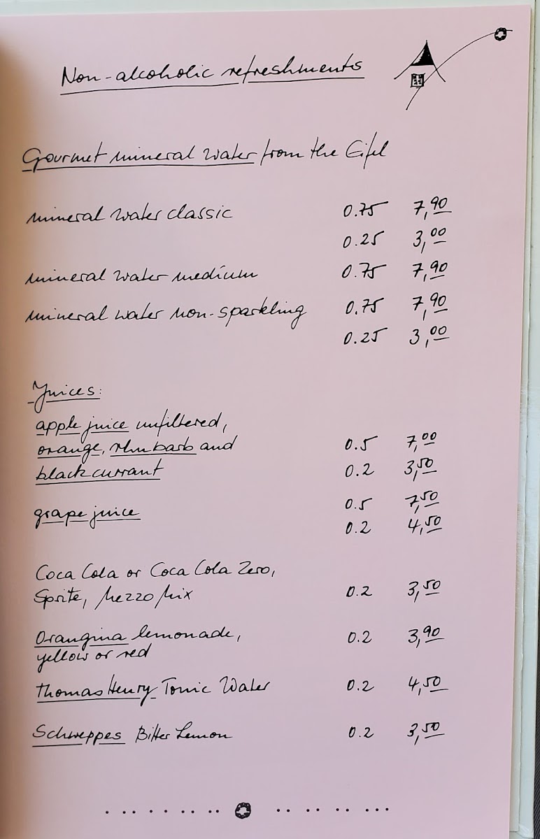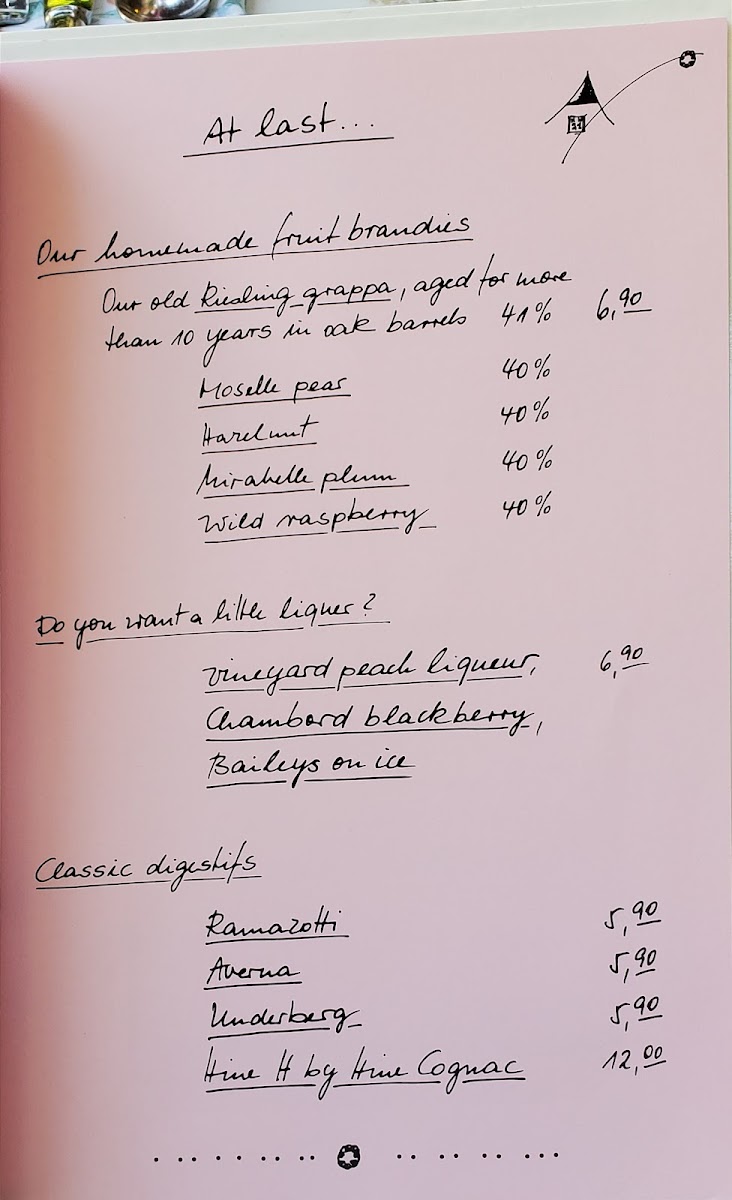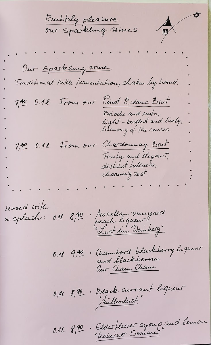 “ This is a tough one. It is difficult to describe the feeling of luxury and the sense of perfection. The lady that welcomed us was very charming and led us to our place. At first inside in the restaurant but later we got a place outside on one of the terraces. It was enchanting and so beautiful that it was almost a fairytale. With my view on one of the cabins, I was waiting for Snow White to show herself. The food was very good and looked beautifully. Trust me, my words are not good enough. If you are in the Mosel area, please do yourself a favor and check this place out. ”