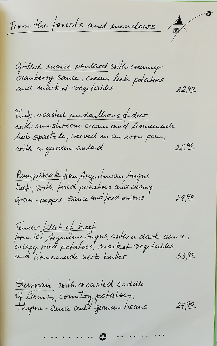 “ A hidden charming place. I came today with my husband to celebrate our wedding anniversary. We saw the recommendation in the Michelin guide list and took the opportunity. The place its like out of a book, very nice, cozy and clean. The attention at the reception was good and the lady who greeted us was very nice and friendly. We were seated in a cellar and our table got different napkins, as we commented on the reservation that we were going to celebrate our anniversary, it was a very sweet touch. For me as non-german (but I do speak it very well) was a bit difficult to read the menu. It was a tat difficult because the menu is beautifully written by hand (in cursive), so maybe expect to request help from the staff. We ordered a white wine, grauburgunder, which for my taste was delicious. For food we ordered a potato soup and the garlic bread to start. Then we moved to the trout and the beef steak. The steak was amazing. For desert we had rice pudding and the apple pie, we recommend the second. The food was delicious, we were very happy. By the time of paying the server brought us a small card wishing us a happy anniversary and a carpe diem stone. Very beautiful gesture. We recommend this place very much and hope to visit it again soon. ”